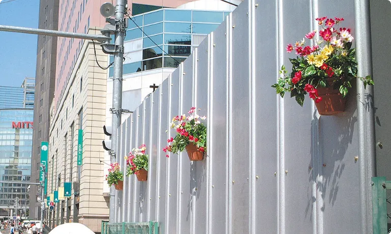 工事現場では、周囲に設置する仮囲いにアートフラワー等を施して、環境の美化に配慮しています。